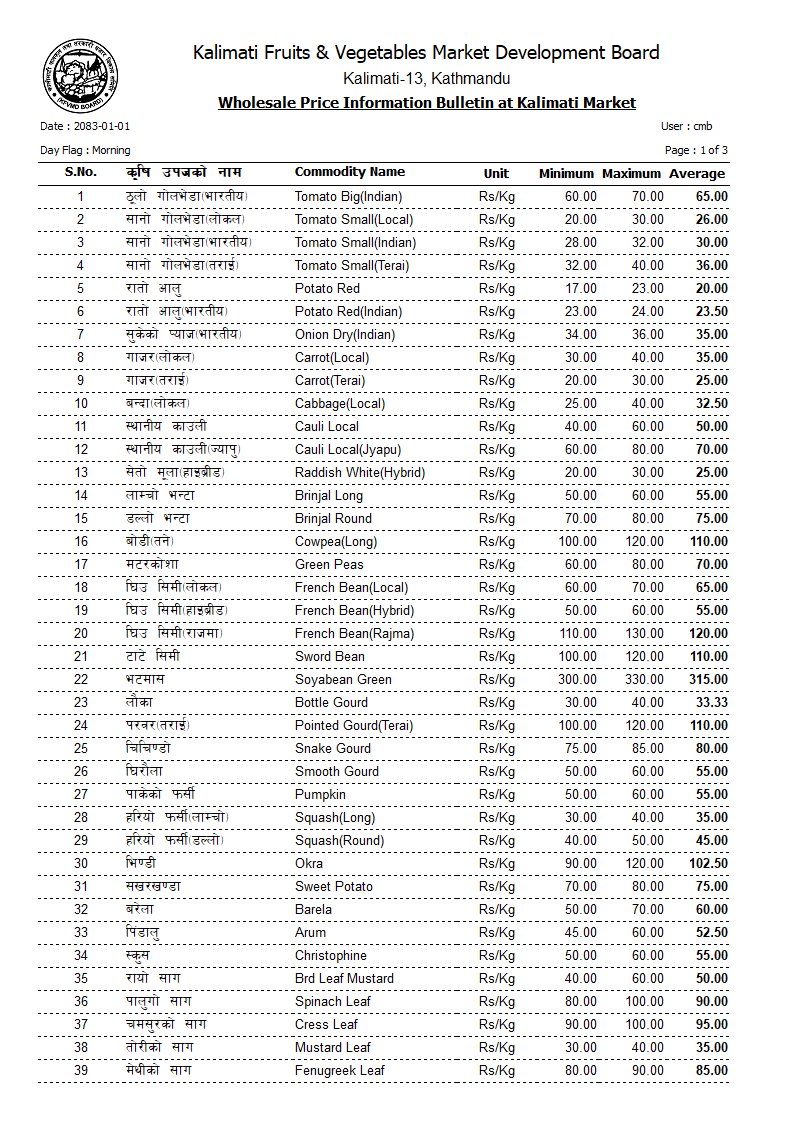 कालिमाटीमा हिजो ठूलो भारतीय गोलभेँडा ६५, सानो लोकल गोलभेँडा २६, रातो आलु २०, भारतीय आलु २२, भारतीय सुकेको प्याज ३५, तराईको गाँजर २५, लोकल बन्दा ३०, स्थानीय काउली ५०, लाम्चो भन्टा ६०, डल्ले भन्टा ७५, हाइब्रिड मुला २५ रुपैयाँ प्रतिकिलो थियो।