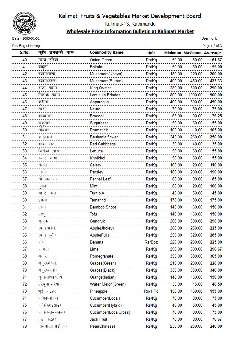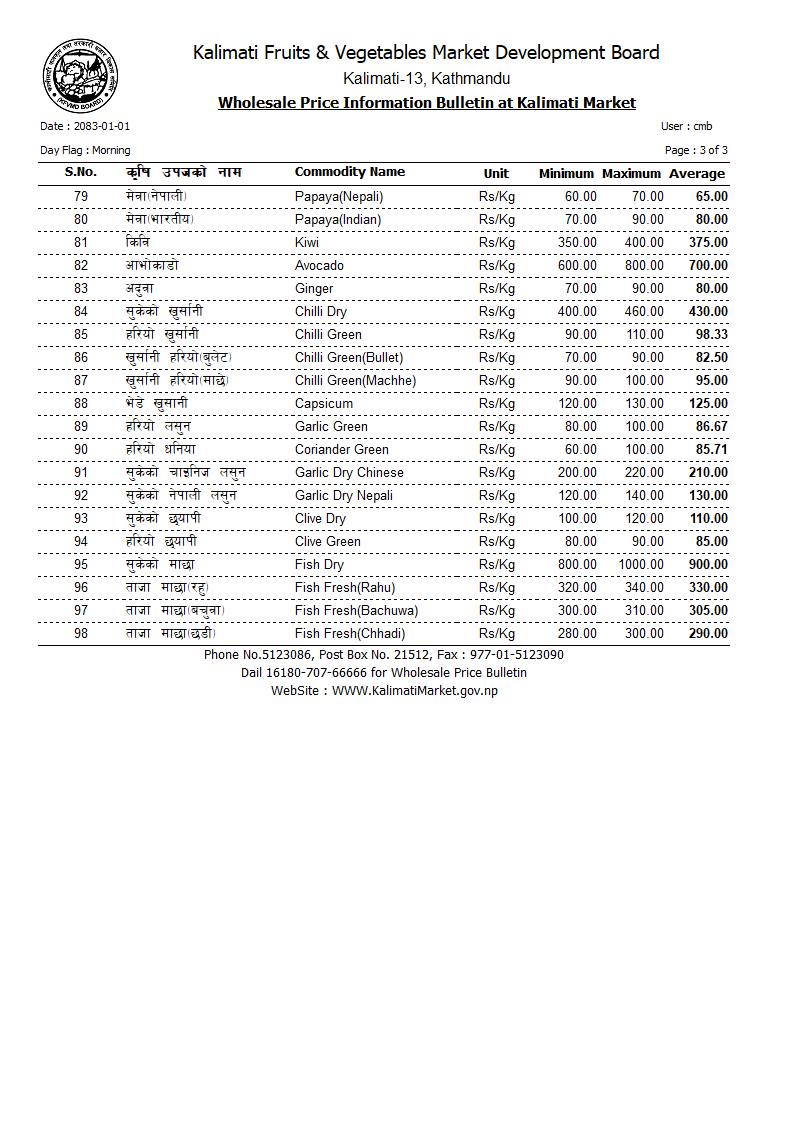 तनेबोडी ११०, करेला ९७, लौका ५५, घिरौँला ५५, परबल ९०, हरियो डल्ले फर्सी ५०, पाकेको फर्सी ५५, भिन्डी ९३, कन्य च्याउ २३५, डल्ले च्याउ ३७५, कुरिलो ४५०, न्यूरो ७५, ब्रोकाउली ८५, चुकन्दर ५१ रुपैयाँ प्रतिकिलो थियो।