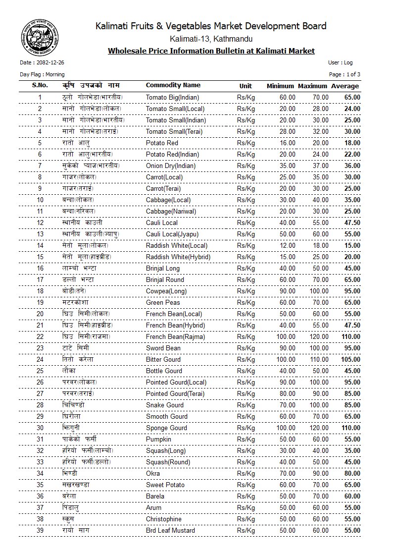 गाजर (लोकल) प्रतिकिलो ३५, गाजर (तराई) प्रतिकिलो ३०, बन्दा (लोकल) प्रतिकिलो ४०, बन्दा (नरिबल) प्रतिकिलो ३०, काउली स्थानीय प्रतिकिलो ५५, काउली स्थानीय (ज्यापु) प्रतिकिलो ६०, सेतो मूला (लोकल) प्रतिकिलो १८, सेतो मूला (हाइब्रिड) प्रतिकिलो २५, भन्टा लाम्चो प्रतिकिलो ५० र भन्टा डल्लो प्रतिकिलो ७० कायम भएको छ ।