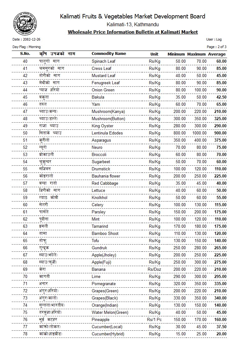 रायोसाग प्रतिकिलो ६०, पालुङ्गो प्रतिकेजी ७०, चमसुर प्रतिकिलो ९०, तोरीसाग प्रतिकिलो ५०, मेथी प्रतिकिलो ९०, हरियो प्याज प्रतिकिलो १००, बकुला प्रतिकिलो ५०, तल प्रतिकिलो ७०, च्याउ (कन्य) प्रतिकिलो २२०, च्याउ (डल्ले) प्रतिकिलो ३५०, राजा च्याउ प्रतिकेजी ३०० र सिताके च्याउ प्रतिकेजी १,००० निर्धारण गरिएको छ ।