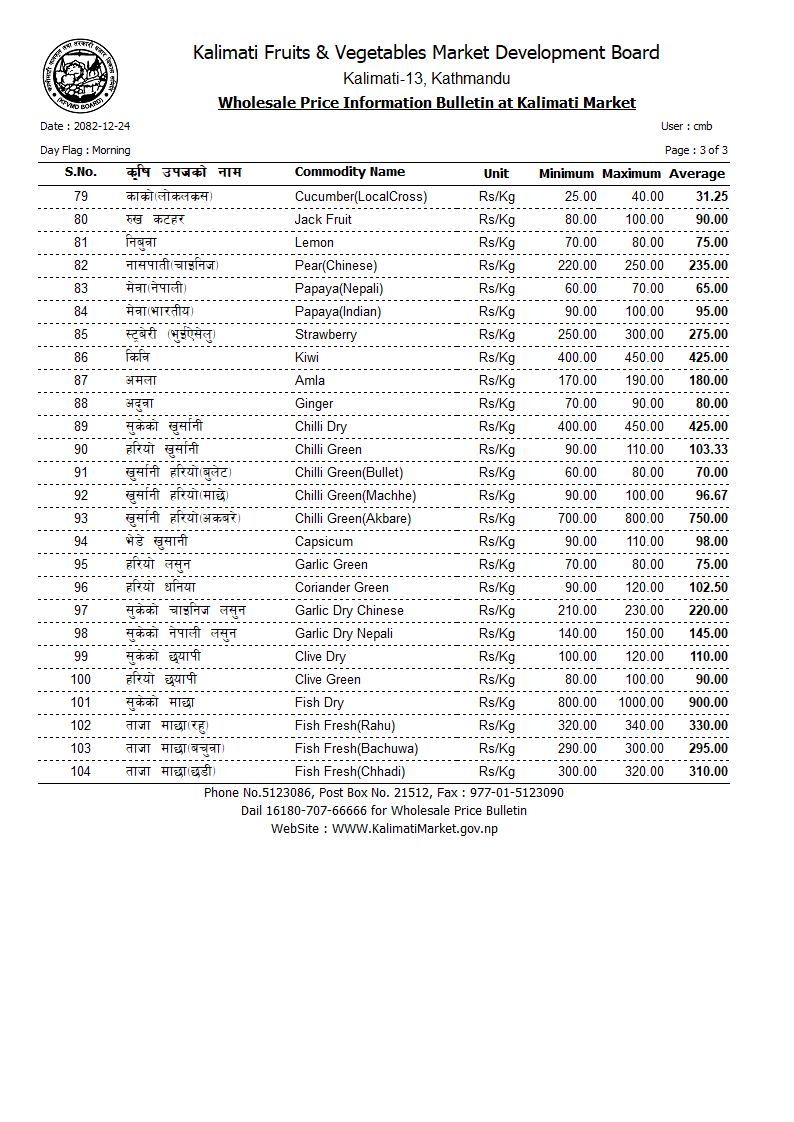 तनेबोडी ९३, करेला १५६, लौका ५०, घिरौँला ६५, तराईको परबल ९५, हरियो डल्ले फर्सी ४५, पाकेको फर्सी ५५, भिन्डी १०५, कन्य च्याउ १६५, डल्ले च्याउ २७५, कुरिलो ३७५, न्यूरो ७५, ब्रोकाउली ७०, चुकन्दर ५५ रुपैयाँ प्रतिकिलो छ।