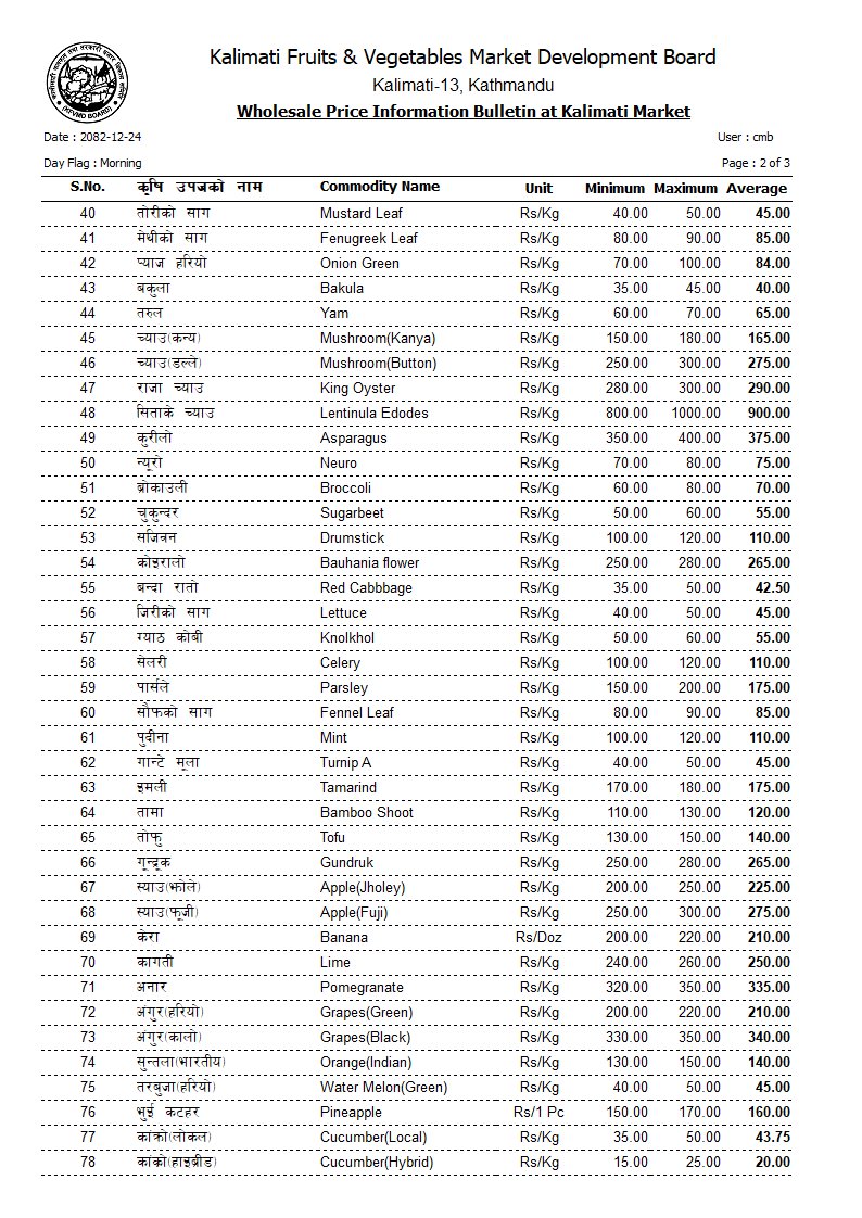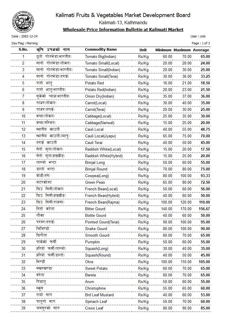 तनेबोडी ९३, करेला १५६, लौका ५०, घिरौँला ६५, तराईको परबल ९५, हरियो डल्ले फर्सी ४५, पाकेको फर्सी ५५, भिन्डी १०५, कन्य च्याउ १६५, डल्ले च्याउ २७५, कुरिलो ३७५, न्यूरो ७५, ब्रोकाउली ७०, चुकन्दर ५५ रुपैयाँ प्रतिकिलो छ।