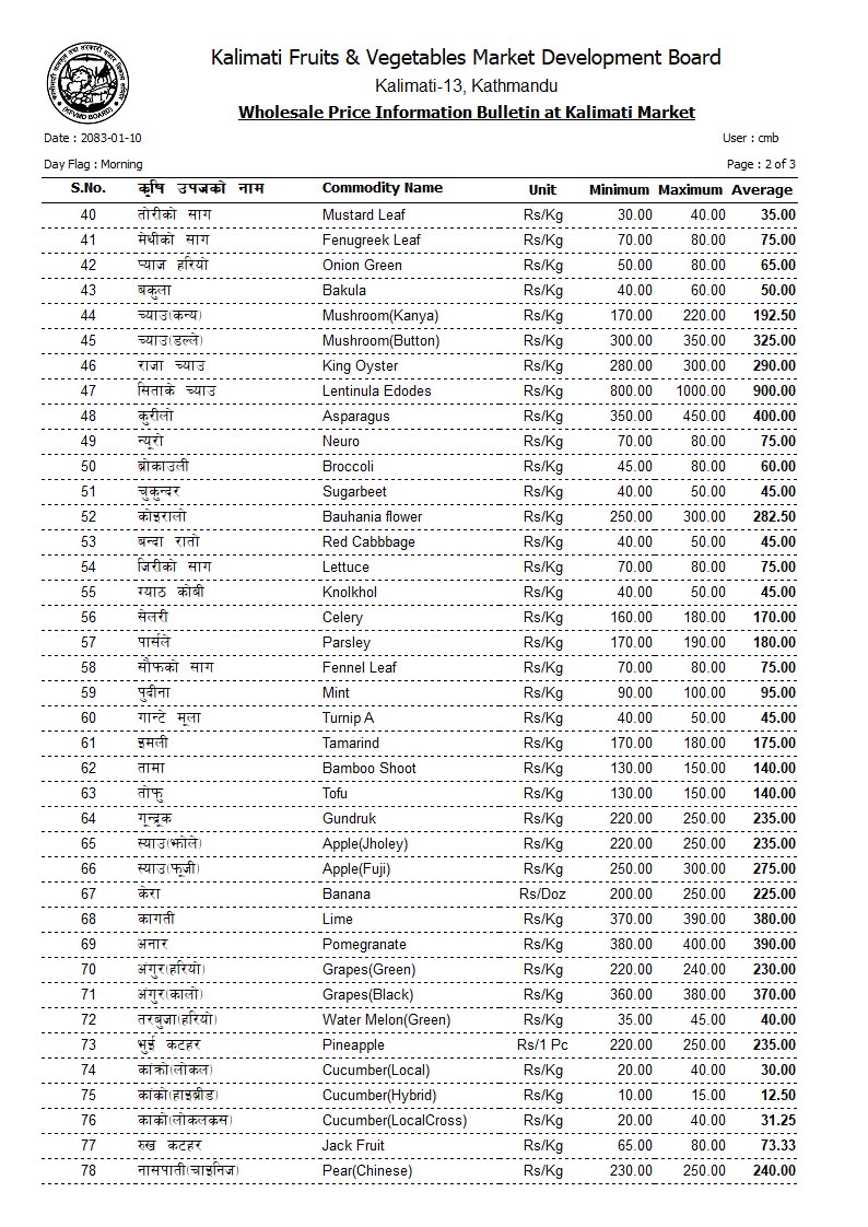 तनेबोडी ४२, लौका १३, घिरौँला २३, लोकल परबल ९५, हरियो डल्ले फर्सी १७, पाकेको फर्सी ५७, भिन्डी ४१, कन्य च्याउ १५०, डल्ले च्याउ ३२५, कुरिलो ४००, न्यूरो ७५, ब्रोकाउली ५५ रुपैयाँ प्रतिकिलो थियो।