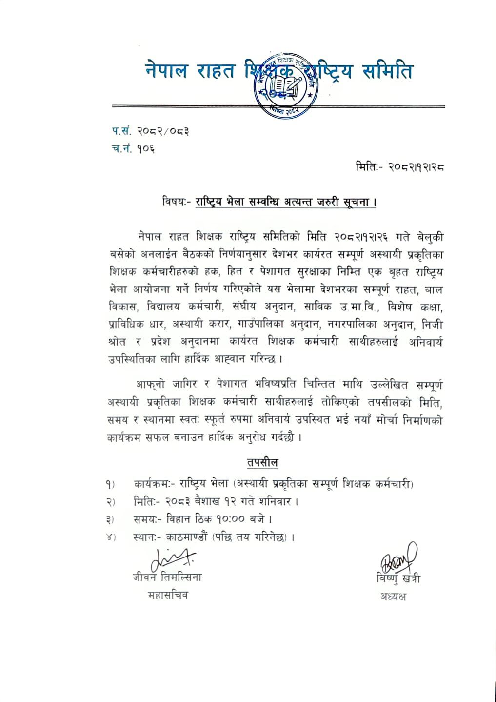 समितिले आफ्नो जागिर र पेशागत भविष्यप्रति चिन्तित सबै अस्थायी शिक्षक–कर्मचारीलाई स्वतःस्फूर्त रूपमा उपस्थित भई कार्यक्रम सफल बनाउन आग्रह गरेको छ। साथै भेलाबाट नयाँ मोर्चा निर्माण गर्ने लक्ष्य लिइएको जनाइएको छ।