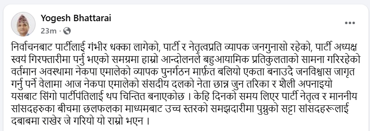 एमाले पार्टी केन्द्रीय कार्यालय च्यासलमा बसेको संसदीय दलको बैठकले दलको नेतामा रामबहादुर थापा ‘बादल’लाई निर्विरोध चयन गरेको छ। सोही विषयमा आपत्ति जनाउँदै उनले लेखेका छन्, ‘केही दिनको समय लिएर पार्टी नेतृत्व र माननीय सांसदहरूका बीचमा छलफलका माध्यमबाट उच्च स्तरको समझदारीमा पुग्नुको सट्टा सांसदहरूलाई दबाबमा राखेर जे गरियो यो राम्रो भएन।’